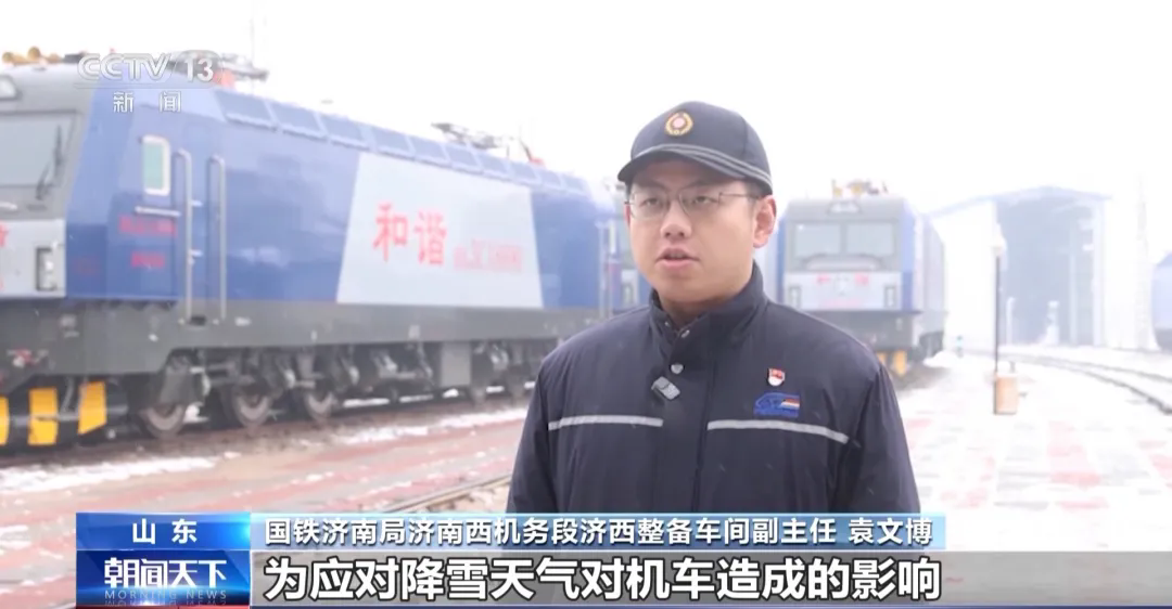 國鐵濟南局濟南西機務段濟西整備車間副主任 袁文博:為應對降雪天氣對機車造成的影響,針對電力機車車頂高壓設備,以及機車走行部等關鍵部位進行重點檢查和整修,確保機車不帶故障隱患出庫。
